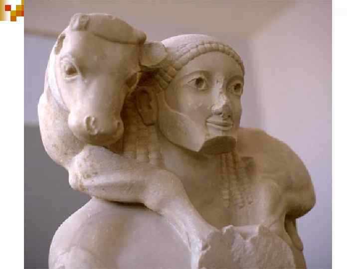 Бородатый герой n Мосхофор трактован с архаическими локонами, но при этом бородат. n Бородатый герой – уже не курос, а зрелый муж. Это признак нового идеала эпохи. n Частично сохранившаяся раска говорит о смелости цветового решения: теленок -синий, глаза Мосхофора — красные, а борода — зеленая.