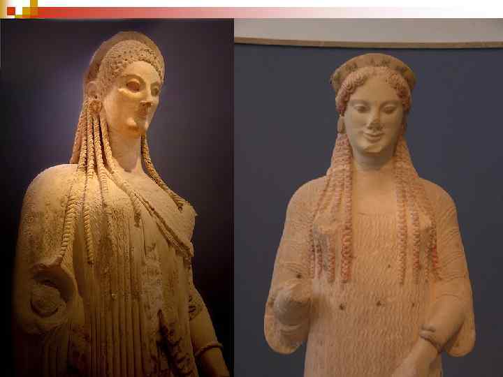 Архаика n n Наиболее типичными образами архаический пластики являлись Ш юношеская обнаженная атлетическая фигура - курос Ш и женская одетая - кора. Так могли изображаться и простые смертные, и богини. Эти образы сохраняют свое место в греческом искусстве во все последующие столетия, лишь видоизменяясь в стиле.