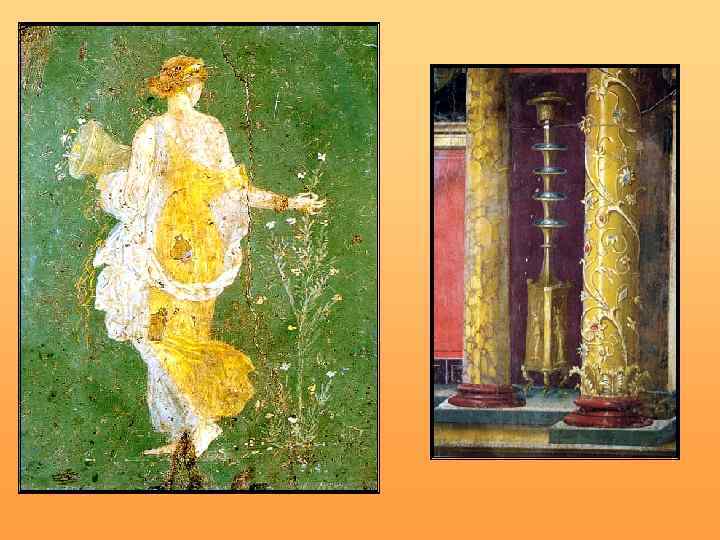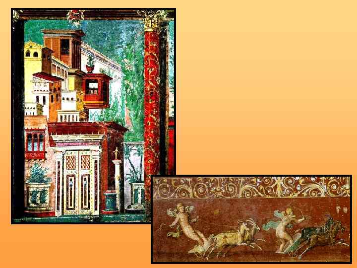 Стили фресковых росписей Древнего Рима: 1) «архитектурно-перспективный стиль» жанровая, пейзажная, мифологическая сцена в обрамлении архитектурных деталей (80 -е – 30 -е годы до н. э. ); 2) сюжетные картины и легкие узоры на свободном фоне (с конца 1 в. до н. э. до 2 -й пол. 1 в. н. э. ); 3) «стиль фантастической архитектуры» сложные, иллюзорно-пространственные архитектурные композиции (2 -я пол. 1 в. н. э. ).