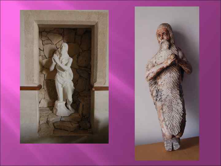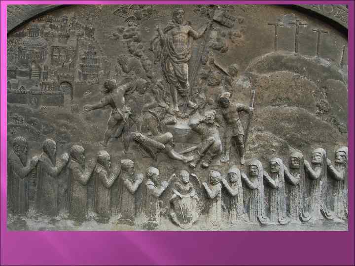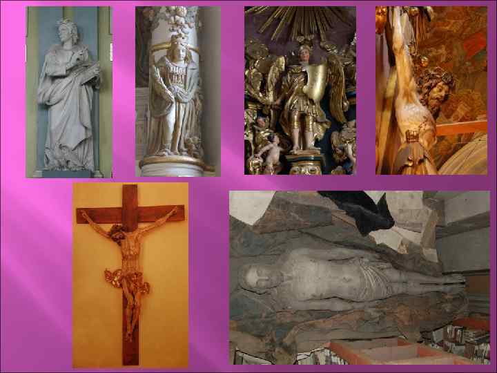 ЗА ФОРМОЮ: - КРУГЛА СКУЛЬПТУРА - РЕЛЬЄФ Кругла скульптура – вид скульптурного твору, який опрацьований зі всіх боків. Головними типами круглої скульптури є: статуя, статуетка, погруддя, торс і скульптурна група. Рельєф (Від італійського relievo - виступ, опуклість, підйом) займає за своїми образотворчим можливостям проміжне місце між круглою скульптурою та зображенням на площині (малюнком, живописом, фрескою). Рельєф, як і кругла скульптура, володіє трьома вимірами (хоча третє, глибинне вимір часто буває кілька скороченим, умовним). Композиція фігур в рельєфі розгортається уздовж площини, яка служить і технічною основою зображення і одночасно фоном, що дозволяє відтворювати в рельєфі пейзаж і багатофігурні сцени. Такий органічний зв'язок з площиною і є особливістю рельєфу.