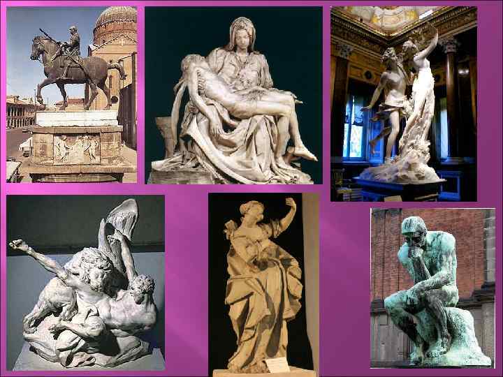 ВІДОМІ СКУЛЬПТОРИ Донателло Італія 15 ст. Монумент кондотьєру Гатамелаті в Падуї Мікеланджело Італія Лоренцо Берніні Італія кін. 15 -16 Пієта, Давид ст. 17 ст. Оздоба собору Св. Петра Іван Георгій Пінзель Україна 18 ст. (Річ Посполита) Твори у Львові та в інших містах Галичини Етьєн Моріс Франція Фальконе 18 ст. Мідний вершник Огюст Роден 19 ст. «Мислитель» Франція