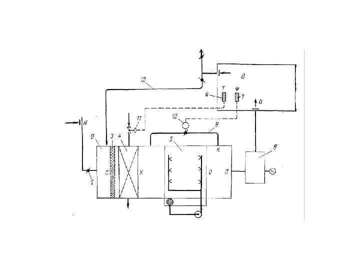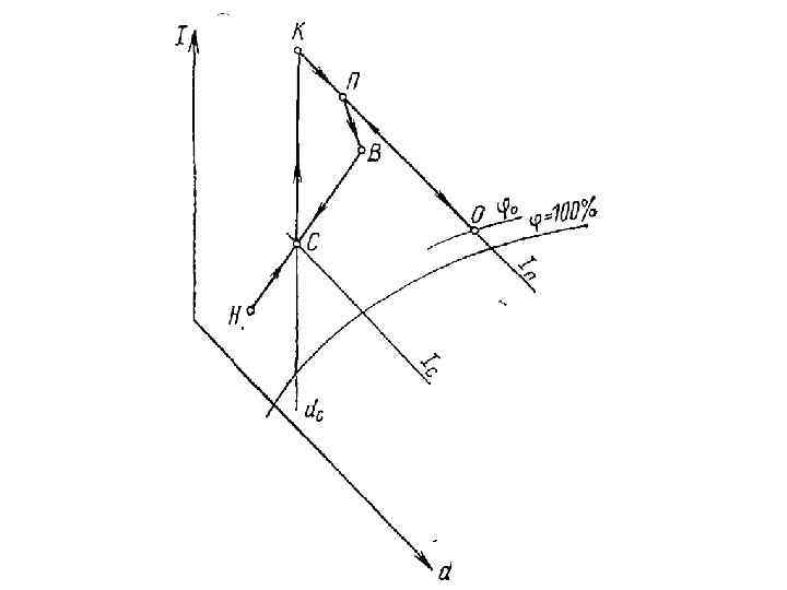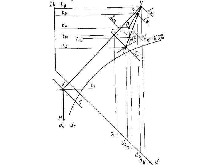 Последовательность построения • На I-d диаграмму наносят точки Н и В, а затем определяют положение точек У и П. • При известных расходах наружного и приточного воздуха определяют расход рециркуляционного воздуха. • Влагосодержание рециркуляционного воздуха dу и смеси dc 2 , соответствующих состоянию приточного воздуха.