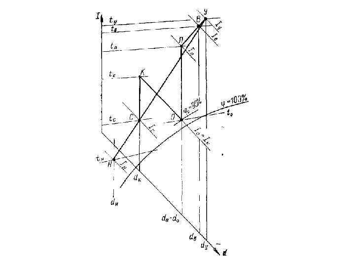 • НУ является линией смеси наружного и рециркуляционного воздуха. • ОК – линия изоэнтальпного увлажнения воздуха в оросительной камере. • ОП – линия процесса нагрева воздуха на 2 ступени подогрева. • ПВУ – линия процесса изменения состояния воздуха в помещении.