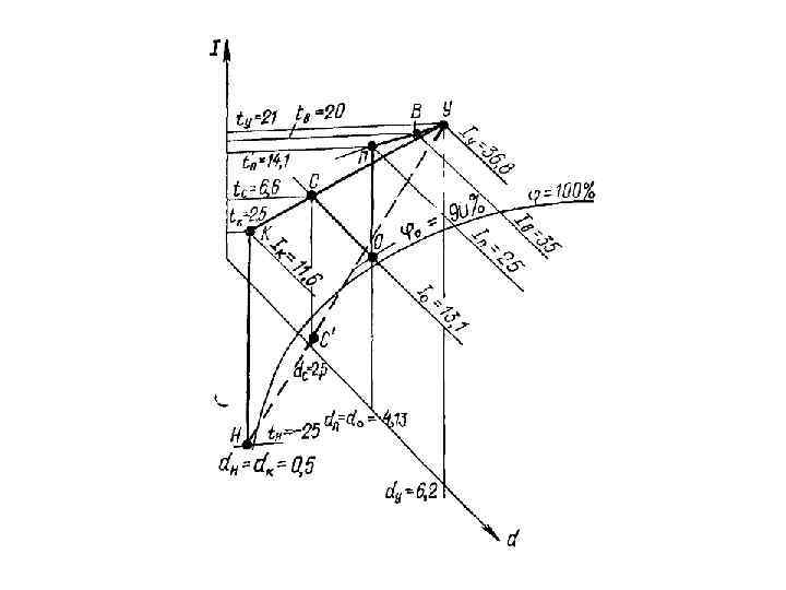 • Проводят линии Io=const и dc=const до их взаимного пересечения в точке С. • Через точки У и С проводят линию до пересечения с линией dн=const в точке К. • НК является линией процесса нагревания воздуха на 1 ступени подогрева. • КУ – линией смеси подогретого наружного и рециркуляционного воздуха