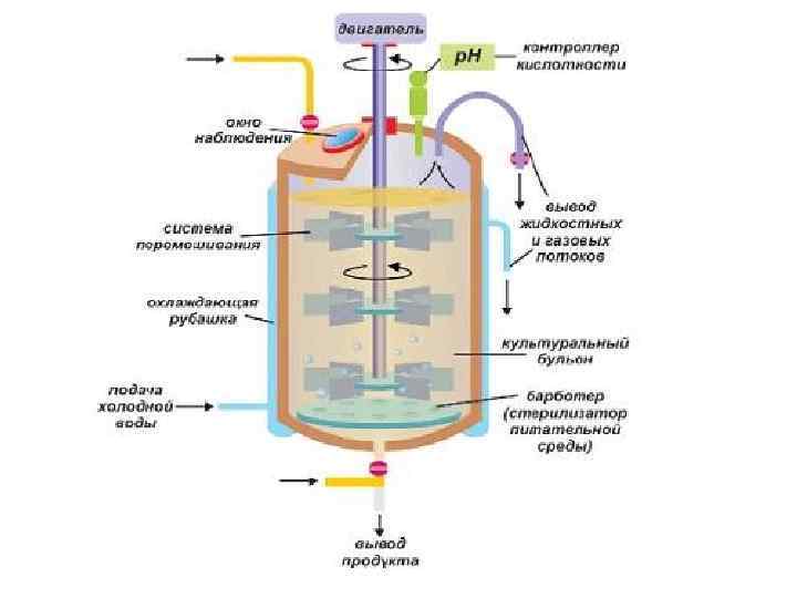 Аппаратурное оформление биотехнологического процесса - ферментеры: по объёму: – лабораторные 0, 5 -100 л, – пилотные 100 л -10 м 3, – промышленные 10 - 100 м 3 и более. • критерии выбора ферментера: – – теплообмен, скорость роста единичной клетки, Тип дыхания биообъекта, Вид транспорта и превращения субстрата в клетке – время размножения отдельной клетке.