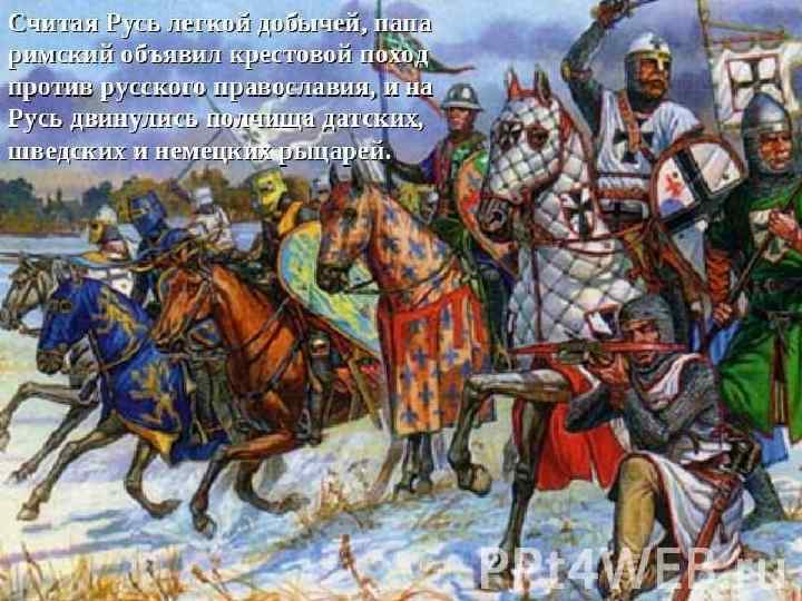 Невская битва 1240 года В 1240 году множество шведских кораблей подошло к Неве под командованием Бюргера. Александр, ему не было ещё тогда 20 лет, долго молился в новгородском храме Святой Софии. Выйдя из храма, он укрепил дружину исполненными веры словами: «не в силе Бог, а в правде. Иные- с оружием, иные на конях, а мы имя господа Бога нашего призовём!»