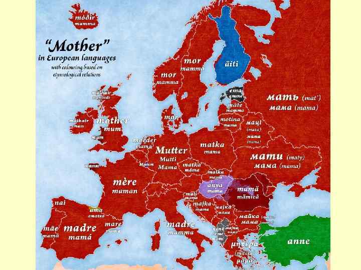 - русское слово «мать» имеет параллели в древнеиндийском (mata), латинском (mater), немецком (mouter), армянском (mair), латышском (mate); - та же ситуация с - русским числом «три» - это английское «three» ; латинское «tres» ; - русский «нос» это английский «nose» , немецкий «nase» и т. д.