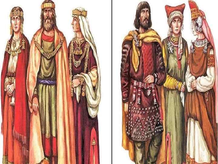 Люди знатные и богатые носили рубахи из тонких тканей или шёлка, порты из парчи. Верхней одеждой знати были епанчи – плащи без рукавов, украшенные мехом, камнями, расшитые золотом и серебром. На ногах красовались кожаные сапоги.