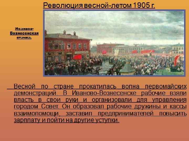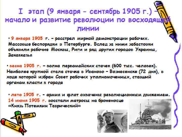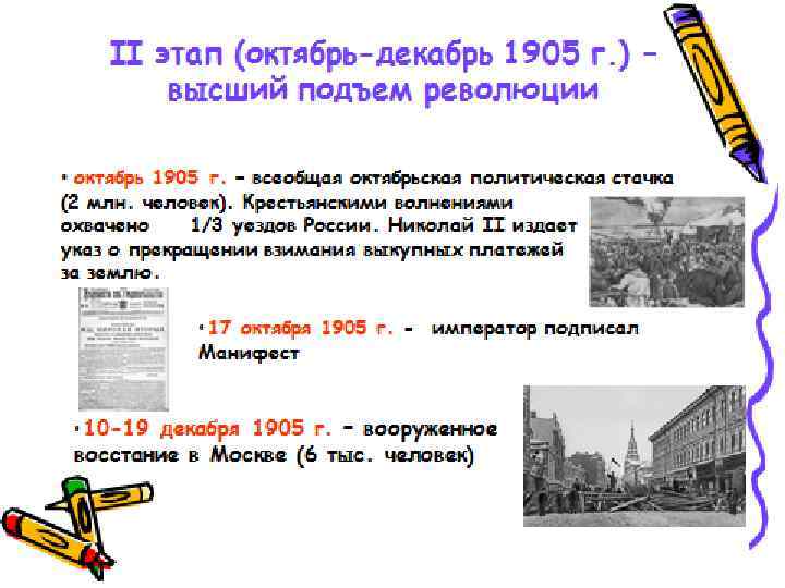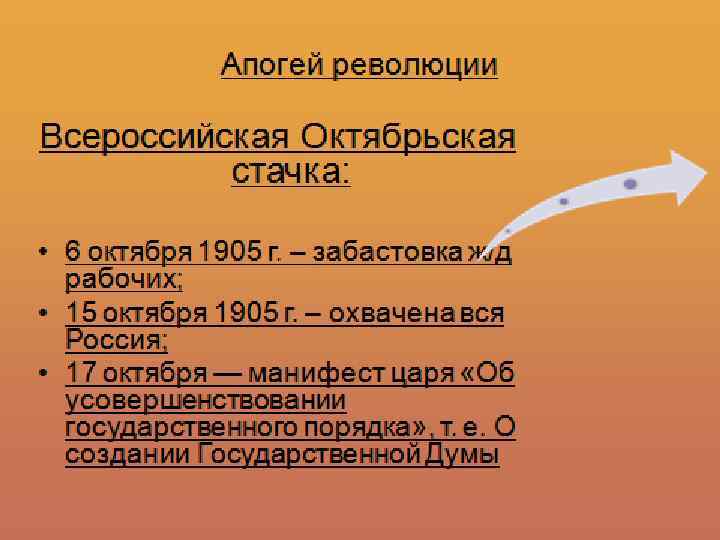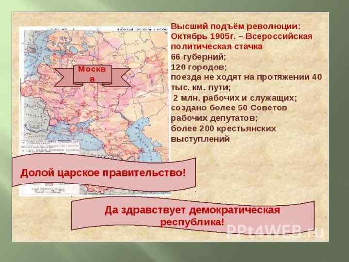 Результаты первой русской революции 1905 -1907 г. : 1. Главный итог революции — это революционные изменения в сознании народа. Революция нанесла удар по самодержавию, в стране появились элементы демократии — Государственная Дума, многопартийность, признание прав личности, но без гарантий их соблюдения. 2. В деревне были отменены выкупные платежи, снижена арендная плата за землю. Но аграрный вопрос не был решен: сохранялось помещичье землевладение. 3. Рабочие получили право создавать профсоюзы, разрешались забастовки. Рабочий день сокращен до 9 часов, повышена зарплата. 4. Русификаторская политика самодержавия была значительно ограничена: в школах вводилось преподавание на национальных языках. Национальные окраины получили представительство в Думе.
