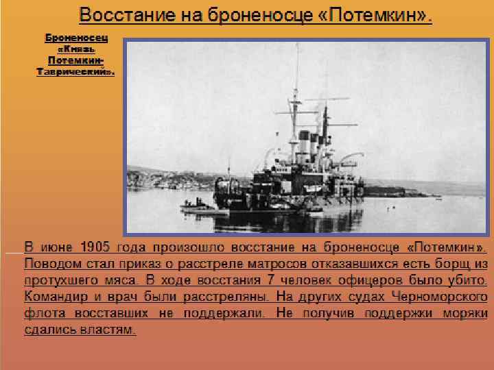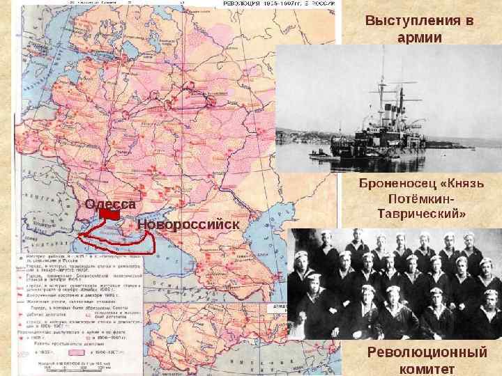 Армия и флот в революции 1905 -1907 гг. Июнь 1905 г. – Восстание на броненосце «Потемкин» Июль 1905 г. – Волна недовольства моряков в Кронштадте, Свеаборге Ноябрь 1905 г. – восстание солдат и матросов Черноморского флота