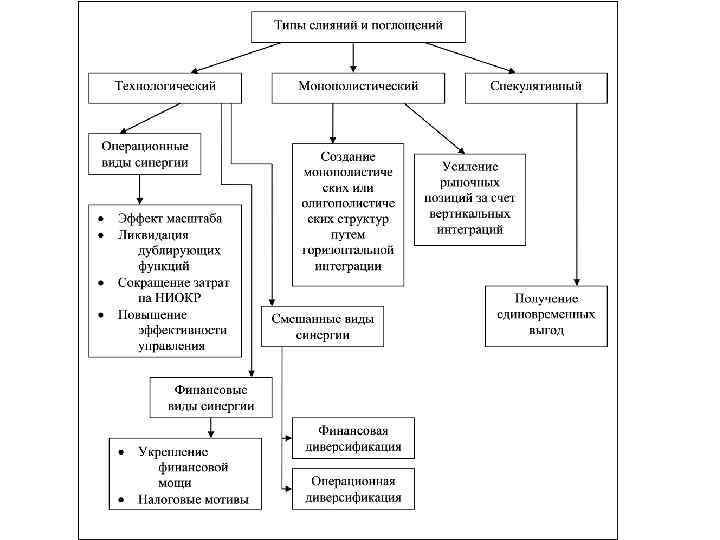 Типы слияний и поглощений, классифицированных по источникам формирования прибыли Типы слияний и поглощений Технологический Операционная синергия Монополистический Финансовая синергия Смешанная синергия Спекулятивный
