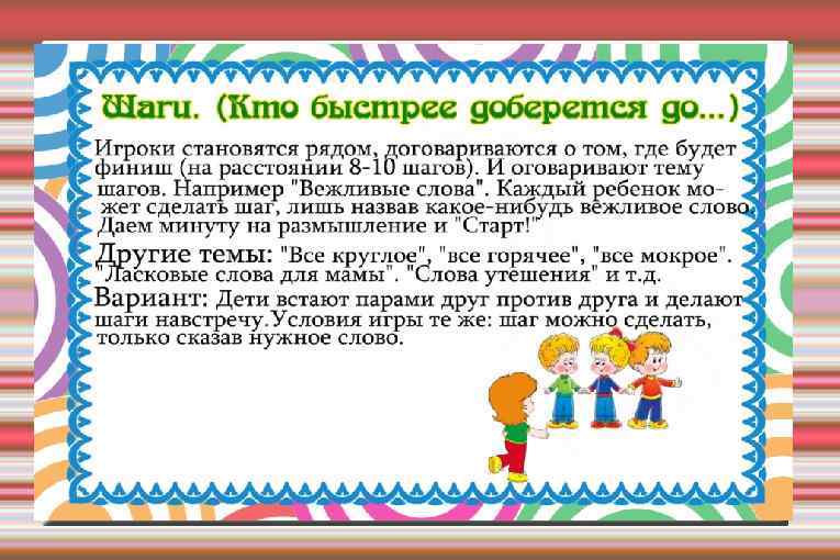 Тематические группы слов, изучаемые в детском саду. . Программой воспитания и обучения в детском саду предусмотрено изучение нескольких тематических групп слов, которые называют: 1. Близких ребенку людей, их родственные и общественные отношения, их имена; 2. Самого ребенка, части его тела; 3. Предметы быта, игрушки; 4. Вещи из интерьера помещений, где живет, находиться ребенок (комната, двор, сад, парк, улица); 5. Объекты живой природы (животные, их части тела, повадки) 6. Объекты неживой природы в сезонных изменениях в разные времена года); 7. Различные виды труда людей; 8. Явления общественной жизни.