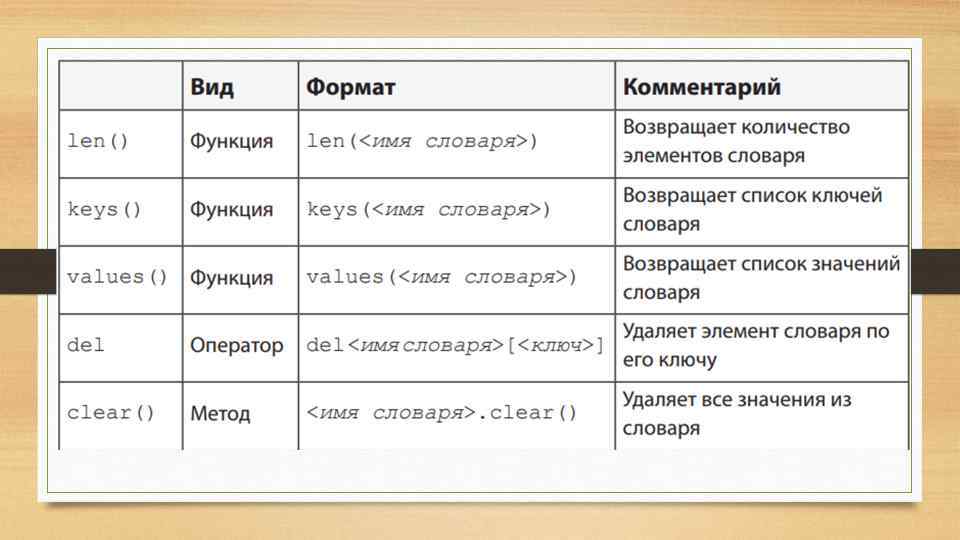 Словари в Python - неупорядоченные коллекции произвольных объектов с доступом по ключу. Их иногда ещё называют ассоциативными массивами или хеш-таблицами. Элементы словаря состоят из двух компонентов. Первый называется «ключ» , второй – «значение» . Простейшие примеры информации, которую в программе удобно хранить в виде словаря: • имя человека и дата его дня рождения; • номер авиарейса и аэропорт назначения; • название государства и его столица Ключом в словаре Python может быть любой так называемый «неизменяемый тип» данных, к которому относится число, символьная строка или кортеж (неизменяемый набор значений).