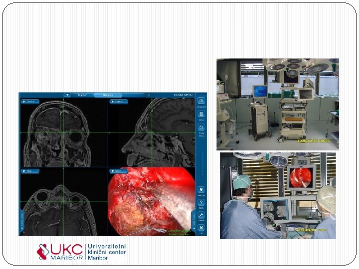 Типичный взгляд на операционную во время проведения вмешательства эндоскопической хирургии. УКЦ г. Марибор в своей деятельности в лечении последствий хронического риносинусита следует направлениям минимально инвазийной хирургии. Первыми в Юго-восточной Европе мы выполнили балонную синосопластику, представляющую собой лечение последствий хронического заболевания синусов (носовая полость). После вмешательства пациент благодаря технике минимальной инвазии, проведенной под местным наркозом, выписывается из больницы уже после нескольких часов после операции. По мнению специалистов использование такой технологии при некоторых пациентах представляет собой значительный прогресс, так как быстро приводит к желаемому результату и является щадящей по отношению к больному. Maриборские специалисты Отделения ОРЛ и Отделения нейрохирургии удалили менингеому (опухоль мозговой оболочки) через нос с применением совершенной эндоскопической техники.