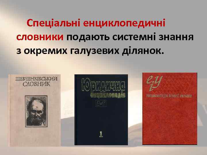 Спеціальні енциклопедичні словники подають системні знання з окремих галузевих ділянок.