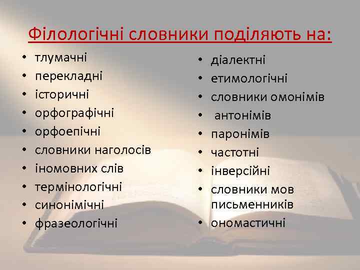 Філологічні словники поділяють на: • • • тлумачні перекладні історичні орфографічні орфоепічні словники наголосів іномовних слів термінологічні синонімічні фразеологічні діалектні етимологічні словники омонімів антонімів паронімів частотні інверсійні словники мов письменників • ономастичні • •