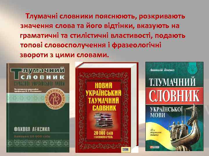 Тлумачні словники пояснюють, розкривають значення слова та його відтінки, вказують на граматичні та стилістичні властивості, подають топові словосполучення і фразеологічні звороти з цими словами.