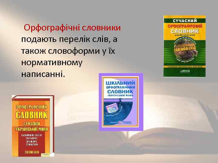 Орфографічні словники подають перелік слів, а також словоформи у їх нормативному написанні.