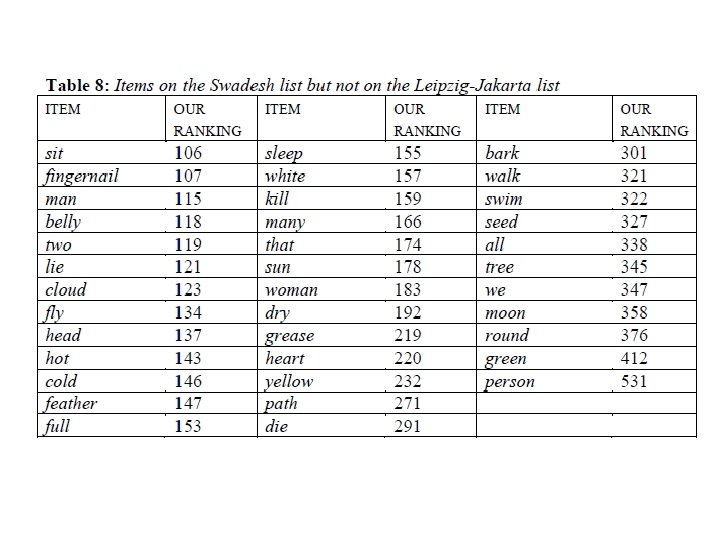 Holman et al (2008) Item 21. skin 22. night 23. leaf 24. rain 25. kill 26. blood I 27. horn 7. liver 28. person 8. eye 29. knee 9. hand 30. one 10. hear 31. nose 32. full 11. tree 33. come 12. fish 34. star 13. name 35. mountain 14. stone 36. fire 15. tooth 37. we 16. breasts 38. drink 39. see 17. you 40. bark 18. path 41. new 19. bone 42. dog 20. tongue 43. sun 1. louse 2. two 3. water 4. ear 5. die 6.