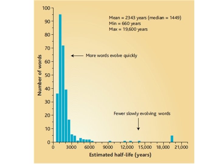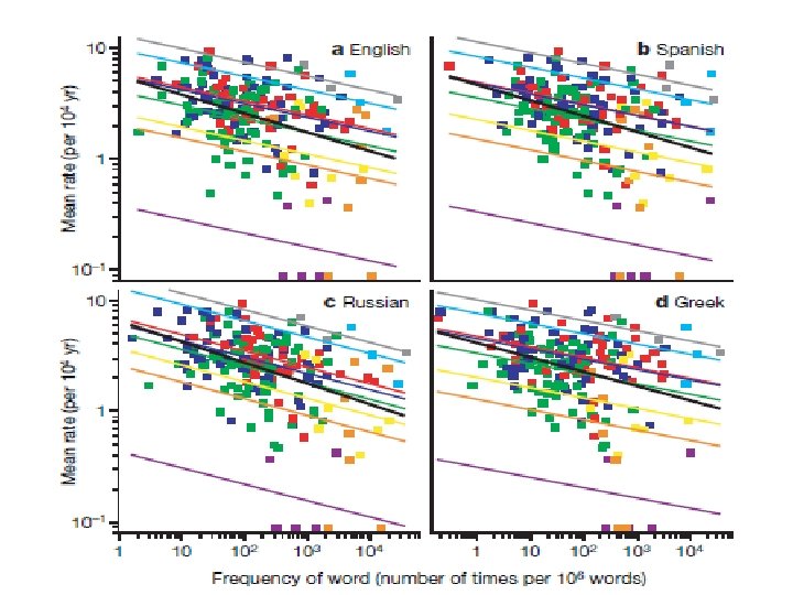 Resistant lexical items • IE : 87 languages, Swadesh 200 wordlist • One to 46 cognates/meaning • Slow changing items : five, I, one, two, who • Frequency play a major role : frequently used words evolve at slower rates Pagel, Atkinson and Meade (2007), Nature