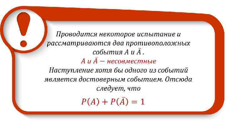 Событие А Выпало 6 очков Событие B Выпало менее 6 очков 1 благоприятный исход из 6 возможных 5 благоприятных исходов из 6 возможных Сумма вероятностей противоположных событий равна 1