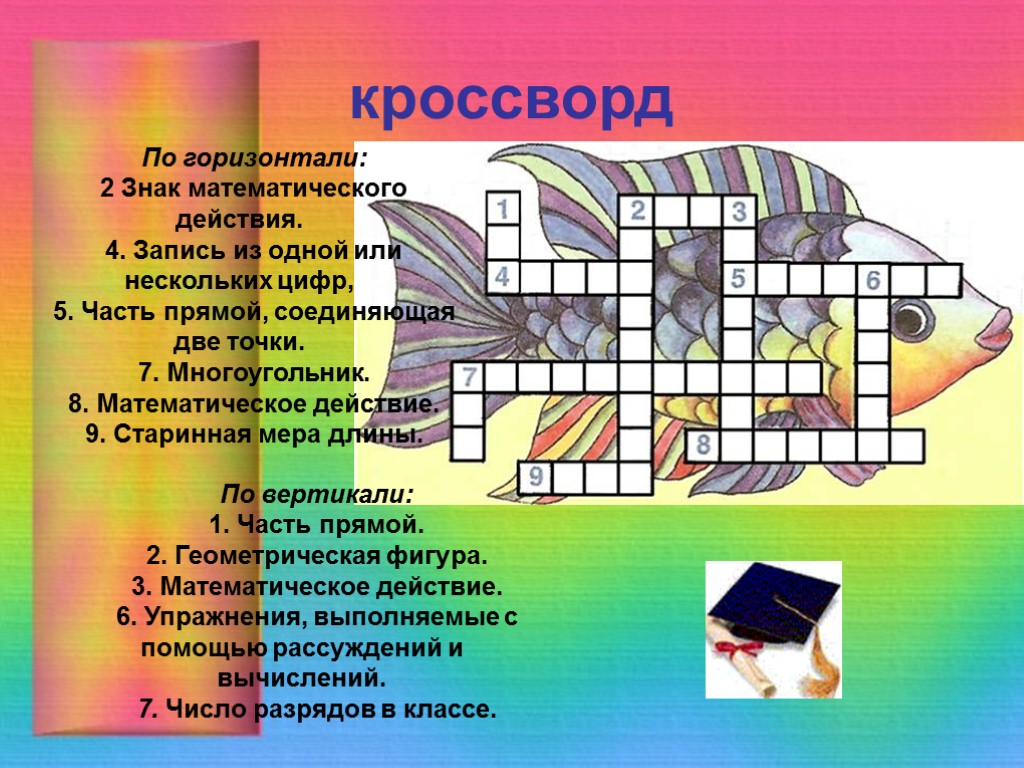 кроссворд По горизонтали: 2 Знак математического действия. 4. Запись из одной или нескольких цифр, 5. Часть прямой, соединяющая две точки. 7. Многоугольник. 8. Математическое действие. 9. Старинная мера длины. По вертикали: 1. Часть прямой. 2. Геометрическая фигура. 3. Математическое действие. 6. Упражнения, выполняемые с помощью рассуждений и вычислений. 7. Число разрядов в классе.