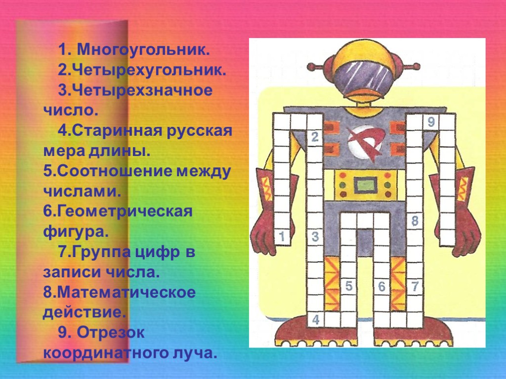 1. Многоугольник. 2.Четырехугольник. 3.Четырехзначное число. 4.Старинная русская мера длины. 5.Соотношение между числами. 6.Геометрическая фигура. 7.Группа цифр в записи числа. 8.Математическое действие. 9. Отрезок координатного луча.