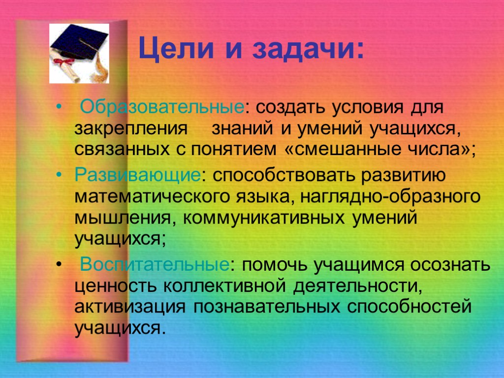 Цели и задачи: Образовательные: создать условия для закрепления знаний и умений учащихся, связанных с понятием «смешанные числа»; Развивающие: способствовать развитию математического языка, наглядно-образного мышления, коммуникативных умений учащихся; Воспитательные: помочь учащимся осознать ценность коллективной деятельности, активизация познавательных способностей учащихся.