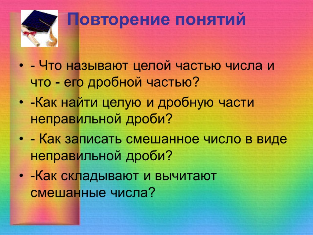 Повторение понятий - Что называют целой частью числа и что - его дробной частью? -Как найти целую и дробную части неправильной дроби? - Как записать смешанное число в виде неправильной дроби? -Как складывают и вычитают смешанные числа?