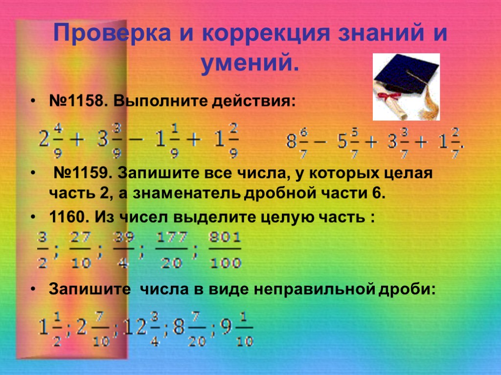 Проверка и коррекция знаний и умений. №1158. Выполните действия: №1159. Запишите все числа, у которых целая часть 2, а знаменатель дробной части 6. 1160. Из чисел выделите целую часть : Запишите числа в виде неправильной дроби: