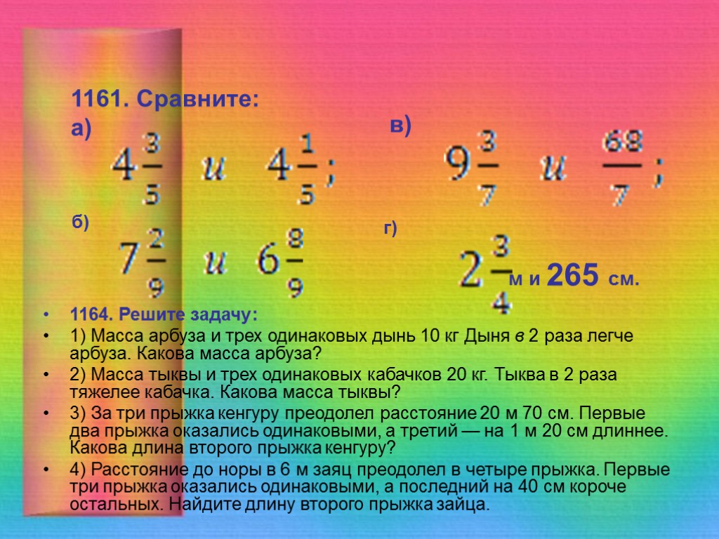 1161. Сравните: а) б) в) м и 265 см. г) 1164. Решите задачу: 1) Масса арбуза и трех одинаковых дынь 10 кг Дыня в 2 раза легче арбуза. Какова масса арбуза? 2) Масса тыквы и трех одинаковых кабачков 20 кг. Тыква в 2 раза тяжелее кабачка. Какова масса тыквы? 3) За три прыжка кенгуру преодолел расстояние 20 м 70 см. Первые два прыжка оказались одинаковыми, а третий — на 1 м 20 см длиннее. Какова длина второго прыжка кенгуру? 4) Расстояние до норы в 6 м заяц преодолел в четыре прыжка. Первые три прыжка оказались одинаковыми, а последний на 40 см короче остальных. Найдите длину второго прыжка зайца.