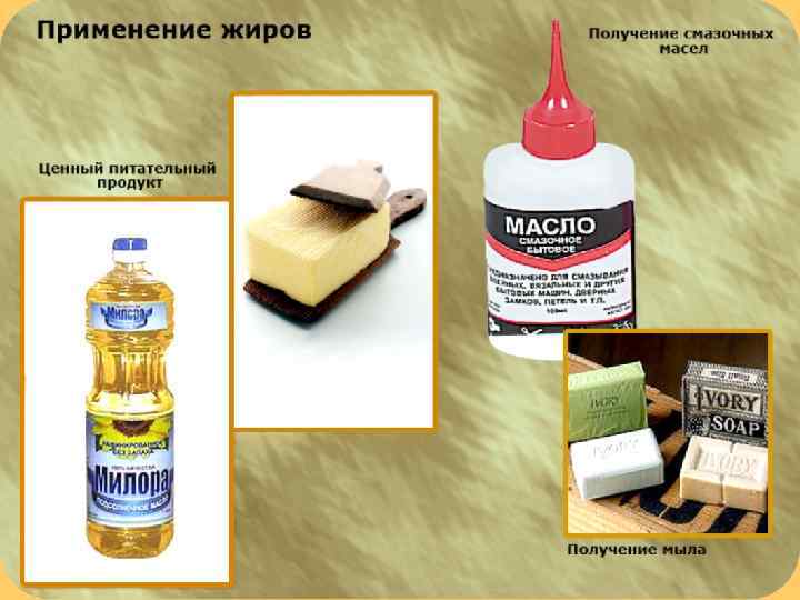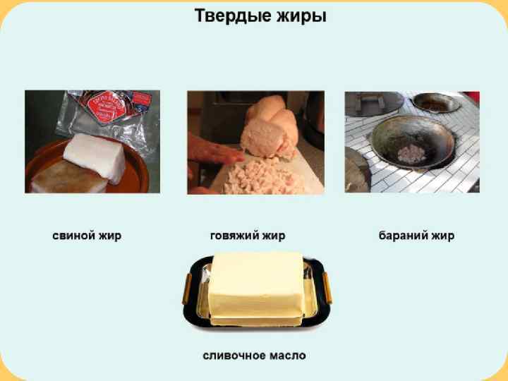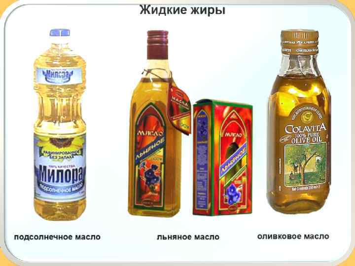 Жиры жиры П о п р о и с х о ж д е н и ю Твердые Жидкие (масла) П о а г р е г а т н о м у с о с т о я н и ю Животные Растительные П о с т р о е н и ю м о л е к у л ы Непредельные Свиной жир Предельные Оливковое масло