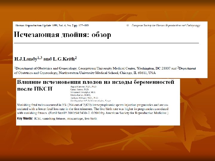 Пациентка К. , 36 лет n n n В августе 2012 года пациентка обратилась в клинику «Генезис» для проведения программы суррогатного материнства. Уровень АМГ составил 1, 9 нг/мл. Пациентке в Израиле в начале августа была сделана инъекция Дифферелина – Депо 3, 75 мг – 60% от ампулы. Через 28 дней после инъекции была произведена контролируемая овариальная стимуляция препаратами р. ФСГ и ЧМГ в ежедневной дозе 500 м. Ед ФСГ. Было получено 8 ооцитов и после оплодотворения методом ИКСИ – 6 эмбрионов. Параллельно проводилась подготовка эндометрия суррогатной матери препаратами эстрадиола. Были перенесены 2 эмбриона А 8 и А 6 на третий день после оплодотворения. Через 28 дней после переноса были в полости матки были определены 2 плодных пузыря с отчетливым сердцебиением в каждом. На сроке 8 недель был диагностирован «синдром исчезающей двойни» и в настоящее время беременность развивается одним плодом.