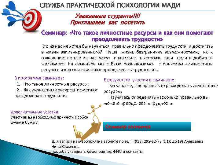 СЛУЖБА ПРАКТИЧЕСКОЙ ПСИХОЛОГИИ МАДИ Уважаемые студенты!!!! Приглашаем вас посетить Семинар: «Что такое личностные ресурсы и как они помогают преодолевать трудности» Кто из нас не хотел бы научиться правильно преодолевать трудности и достигать в жизни запланированного? Наша жизнь безгранична возможностями, но к сожалению не все из нас могут правильно выстроить свои цели и добиться желаемого. На семинаре мы с Вами познакомимся с понятием «личностные ресурсы и как они помогают преодолевать трудности» . В программе семинара: 1. Что такое личностные ресурсы; 2. Как личностные ресурсы помогают преодолевать трудности. Дополнительные условия: Участникам необходимо принести с собой ручку и бумагу. В результате участия в семинаре: Вы узнаете, как правильно расходовать личностные ресурсы; Научитесь определять насколько правильно вы можете преодолевать трудности. Семинар состоится Для записи на мероприятие звоните по тел. : (916) 292 -62 -75 (с 10 до 19) Алексеева Нина Юрьевна. просьба указывать мероприятие, ФИО и контакты.
