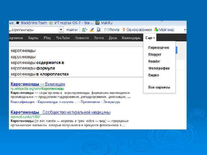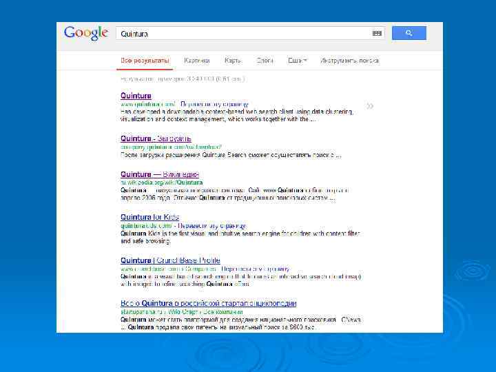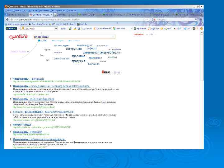 Quintura Отличие Quintura от традиционных поисковых систем раскрывается в концепции «Увидеть и Найти» — увидеть на карте и найти в интернете. Quintura позволяет визуально находить в Рунете документы на русском языке и картинки с учетом морфологии русского языка. Ø Особенность Quintura — визуальное «Облако» или «Карта» слов ассоциаций между картинками или документами, которая является удобным навигатором по ним. Используя принцип Quintura, когда поиск осуществляется одним щелчком мыши, пользователь видит слова на карте и щёлкает мышкой по ним, быстро находя необходимые картинки и документы. Ø Традиционные поисковые системы, как правило, «равнодушны» к предмету поиска пользователя в Интернете, включая поиск по картинкам. В отличие от них, Quintura предлагает слова ассоциации в виде визуального облака. Ø
