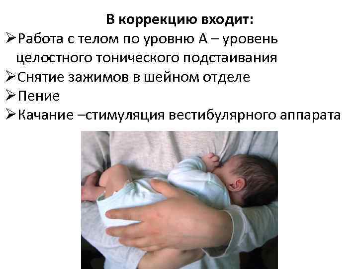 В коррекцию входит: ØРабота с телом по уровню А – уровень целостного тонического подстаивания ØСнятие зажимов в шейном отделе ØПение ØКачание –стимуляция вестибулярного аппарата