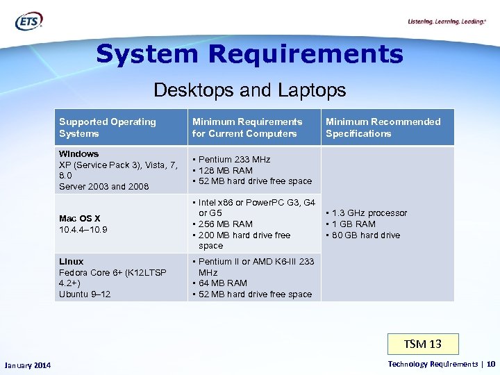 System Requirements Desktops and Laptops Supported Operating Systems Minimum Requirements for Current Computers Minimum Recommended Specifications Windows XP (Service Pack 3), Vista, 7, 8. 0 Server 2003 and 2008 • Pentium 233 MHz • 128 MB RAM • 52 MB hard drive free space Mac OS X 10. 4. 4– 10. 9 • Intel x 86 or Power. PC G 3, G 4 • 1. 3 GHz processor or G 5 • 1 GB RAM • 256 MB RAM • 80 GB hard drive • 200 MB hard drive free space Linux Fedora Core 6+ (K 12 LTSP 4. 2+) Ubuntu 9– 12 • Pentium II or AMD K 6 -III 233 MHz • 64 MB RAM • 52 MB hard drive free space TSM 13 January 2014 Technology Requirements | 10
