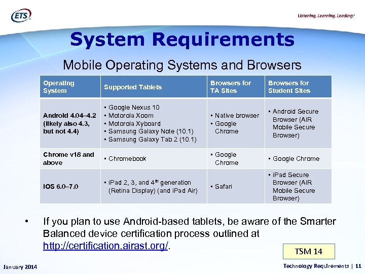System Requirements Mobile Operating Systems and Browsers Operating System Supported Tablets Browsers for TA Sites Browsers for Student Sites Android 4. 04– 4. 2 (likely also 4. 3, but not 4. 4) • • • Native browser • Google Chrome • Android Secure Browser (AIR Mobile Secure Browser) Chrome v 18 and above • Chromebook • Google Chrome • Safari • i. Pad Secure Browser (AIR Mobile Secure Browser) i. OS 6. 0– 7. 0 • • Google Nexus 10 Motorola Xoom Motorola Xyboard Samsung Galaxy Note (10. 1) Samsung Galaxy Tab 2 (10. 1) i. Pad 2, 3, and 4 th generation (Retina Display) (and i. Pad Air) If you plan to use Android-based tablets, be aware of the Smarter Balanced device certification process outlined at http: //certification. airast. org/. TSM 14 January 2014 Technology Requirements | 11