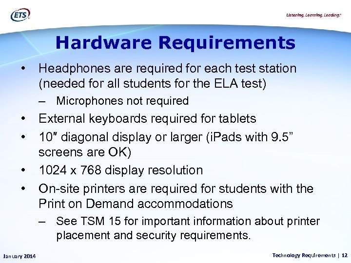 Hardware Requirements • Headphones are required for each test station (needed for all students for the ELA test) – Microphones not required • • External keyboards required for tablets 10″ diagonal display or larger (i. Pads with 9. 5” screens are OK) 1024 x 768 display resolution On-site printers are required for students with the Print on Demand accommodations – See TSM 15 for important information about printer placement and security requirements. January 2014 Technology Requirements | 12