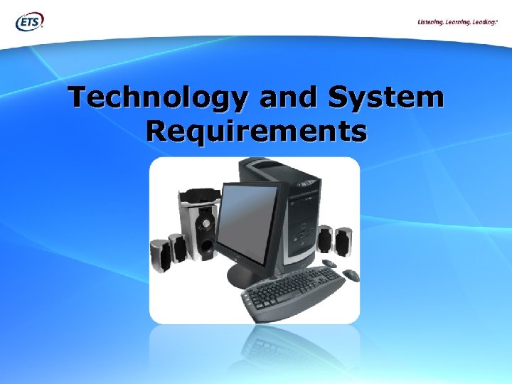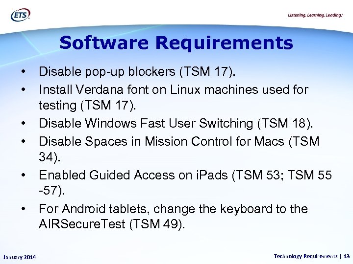 Software Requirements • • • January 2014 Disable pop-up blockers (TSM 17). Install Verdana font on Linux machines used for testing (TSM 17). Disable Windows Fast User Switching (TSM 18). Disable Spaces in Mission Control for Macs (TSM 34). Enabled Guided Access on i. Pads (TSM 53; TSM 55 -57). For Android tablets, change the keyboard to the AIRSecure. Test (TSM 49). Technology Requirements | 13