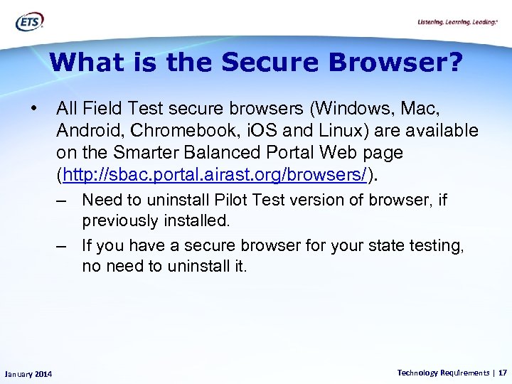 What is the Secure Browser? • The secure browser is a type of software that must be installed on each computer for the 2014 Smarter Balanced Field Test. • There are different versions of the secure browser for different device types and operating systems. January 2014 Technology Requirements | 16