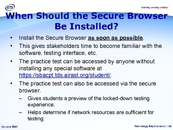 What is the Secure Browser? • All Field Test secure browsers (Windows, Mac, Android, Chromebook, i. OS and Linux) are available on the Smarter Balanced Portal Web page (http: //sbac. portal. airast. org/browsers/). – Need to uninstall Pilot Test version of browser, if previously installed. – If you have a secure browser for your state testing, no need to uninstall it. January 2014 Technology Requirements | 17
