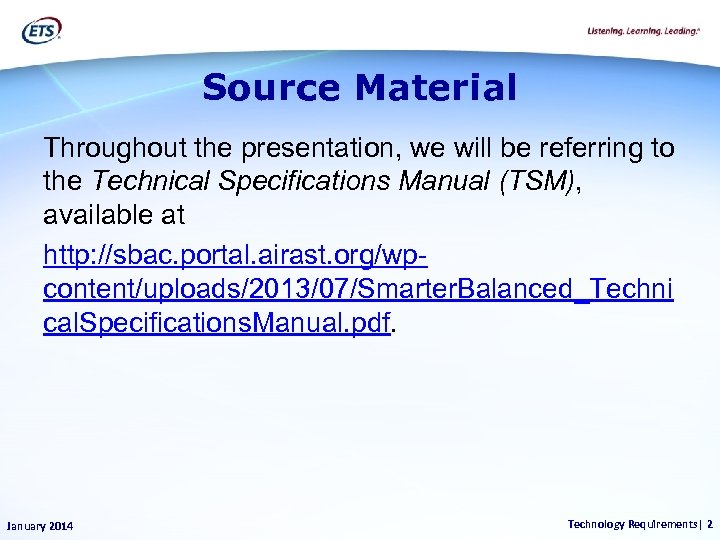 Source Material Throughout the presentation, we will be referring to the Technical Specifications Manual (TSM), available at http: //sbac. portal. airast. org/wpcontent/uploads/2013/07/Smarter. Balanced_Techni cal. Specifications. Manual. pdf. January 2014 Technology Requirements| 2
