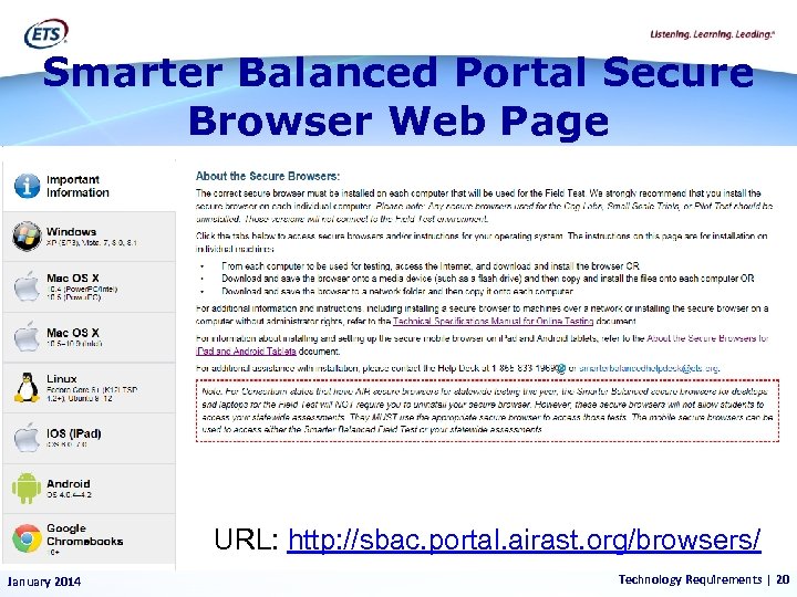 Smarter Balanced Portal Secure Browser Web Page URL: http: //sbac. portal. airast. org/browsers/ January 2014 Technology Requirements | 20