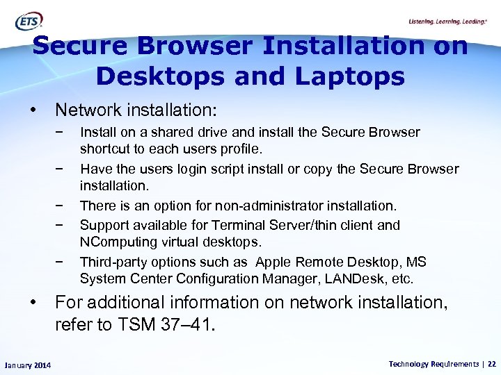 Secure Browser Installation on Desktops and Laptops • One-by-One manual installation: – Download and install on each computer either directly or by transferring the installer via flash drive or network drive. – Additional information on one-by-one manual installation, refer to TSM 27– 36. (Note: Instructions vary by system!) January 2014 Technology Requirements | 21