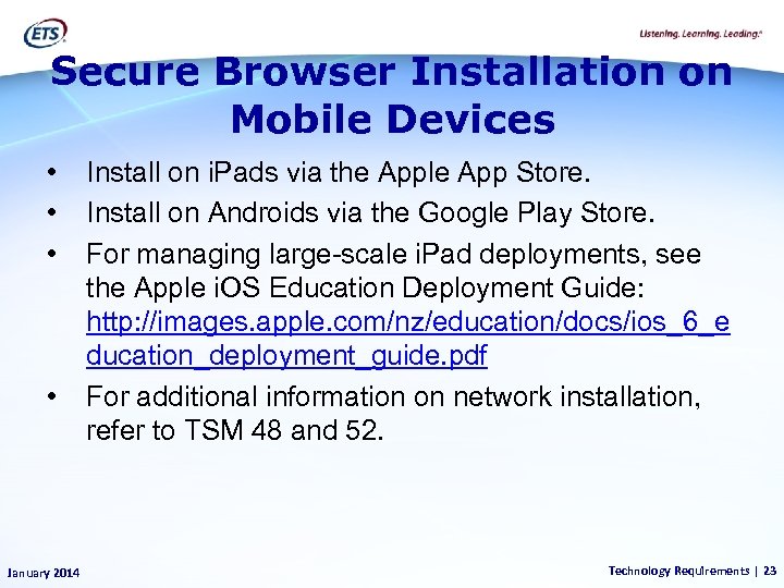Secure Browser Installation on Mobile Devices • • January 2014 Install on i. Pads via the Apple App Store. Install on Androids via the Google Play Store. For managing large-scale i. Pad deployments, see the Apple i. OS Education Deployment Guide: http: //images. apple. com/nz/education/docs/ios_6_e ducation_deployment_guide. pdf For additional information on network installation, refer to TSM 48 and 52. Technology Requirements | 23