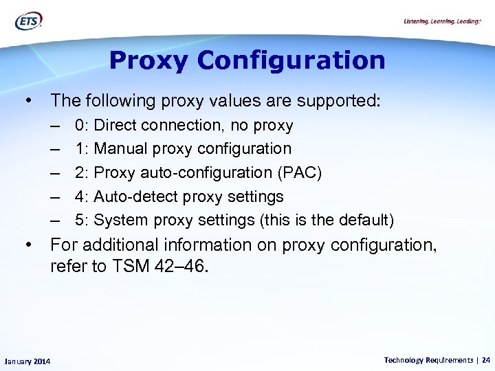 Proxy Configuration • The following proxy values are supported: – – – • January 2014 0: Direct connection, no proxy 1: Manual proxy configuration 2: Proxy auto-configuration (PAC) 4: Auto-detect proxy settings 5: System proxy settings (this is the default) For additional information on proxy configuration, refer to TSM 42– 46. Technology Requirements | 24