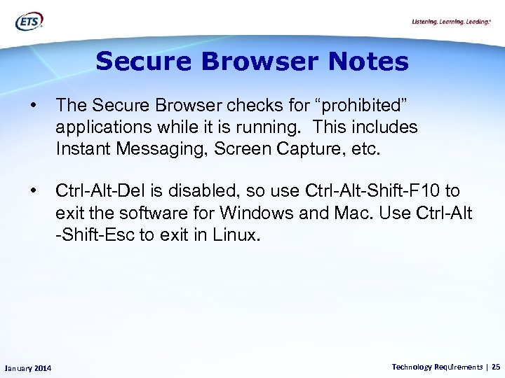 Secure Browser Notes • The Secure Browser checks for “prohibited” applications while it is running. This includes Instant Messaging, Screen Capture, etc. • Ctrl-Alt-Del is disabled, so use Ctrl-Alt-Shift-F 10 to exit the software for Windows and Mac. Use Ctrl-Alt -Shift-Esc to exit in Linux. January 2014 Technology Requirements | 25