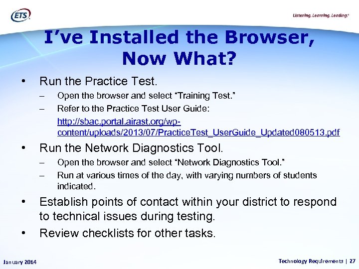 I’ve Installed the Browser, Now What? • Run the Practice Test. – – • Run the Network Diagnostics Tool. – – • • January 2014 Open the browser and select “Training Test. ” Refer to the Practice Test User Guide: http: //sbac. portal. airast. org/wpcontent/uploads/2013/07/Practice. Test_User. Guide_Updated 080513. pdf Open the browser and select “Network Diagnostics Tool. ” Run at various times of the day, with varying numbers of students indicated. Establish points of contact within your district to respond to technical issues during testing. Review checklists for other tasks. Technology Requirements | 27