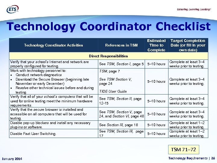 Technology Coordinator Checklist Technology Coordinator Activities Estimated Time to Complete Target Completion Date (or fill in your own date) 5– 10 hours Complete at least 3– 4 weeks prior to testing. See TSM, Section V, page 5– 10 hours 24, and Section VI, page 46 Complete at least 3– 4 weeks prior to testing. References in TSM Direct Responsibilities Verify that your school’s Internet and network are properly configured for testing. Work with technology personnel to: Conduct network diagnostics Download the Secure Browser (beginning late November or early December) Resolve other technical issues before and during testing Verify that all of your school’s computers that will be used for online testing meet the minimum hardware requirements. Verify that the secure browser is installed and accessible on all computers that will be used for testing. Disable pop-up blockers and install any necessary plug-ins or software. Disable Fast User Switching. See TSM, Section I, page 5 TSM, page 7 See TSM Section V, page 24 TIDE User Guide See TSM, Section II, page 12 -15 See Section III, page 16 5– 10 hours See TSM, Section III, page 5– 10 hours 17 Complete at least 1– 2 weeks prior to testing. TSM 71– 72 January 2014 Technology Requirements | 28